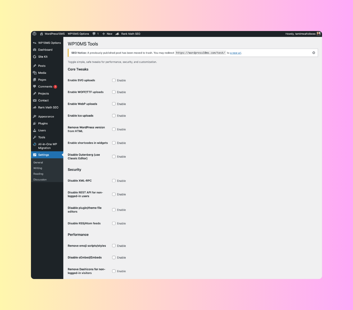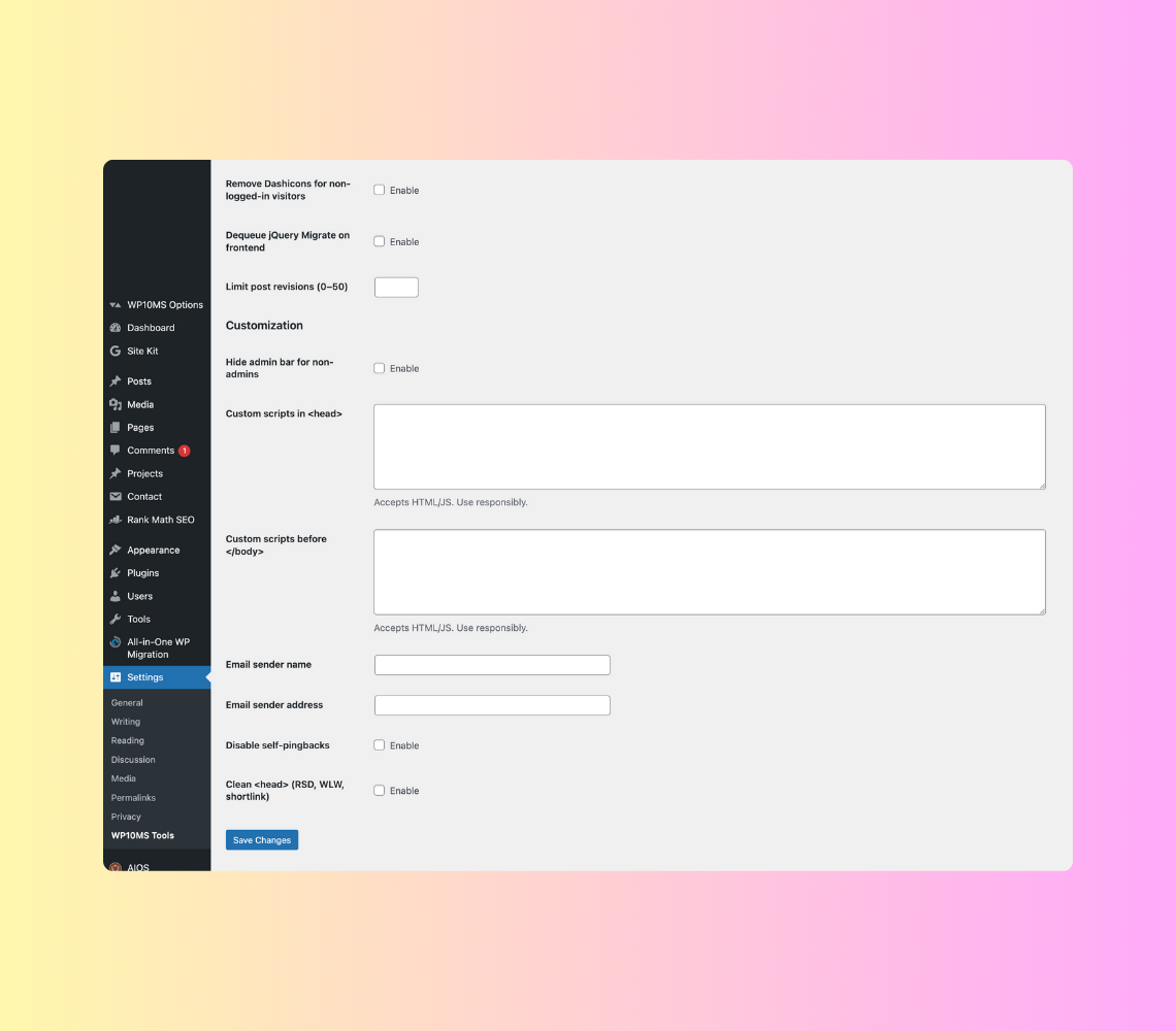 WP10MS Tools is a lightweight, all-in-one WordPress utility plugin developed to centralize commonly needed tweaks, optimizations, and enhancements that are otherwise handled through multiple separate plugins. The main goal of this project was to simplify WordPress site management while improving performance, security, and customization.